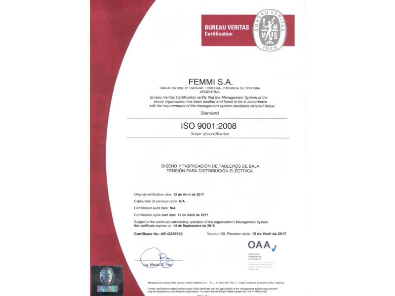 ELECTRO FEMMI S.A.cuenta con profesionales formados en el Bureau Veritas en base a la Norma ISO 50001:2011 - Auditor Interno de Sistemas de Gestión de Energía